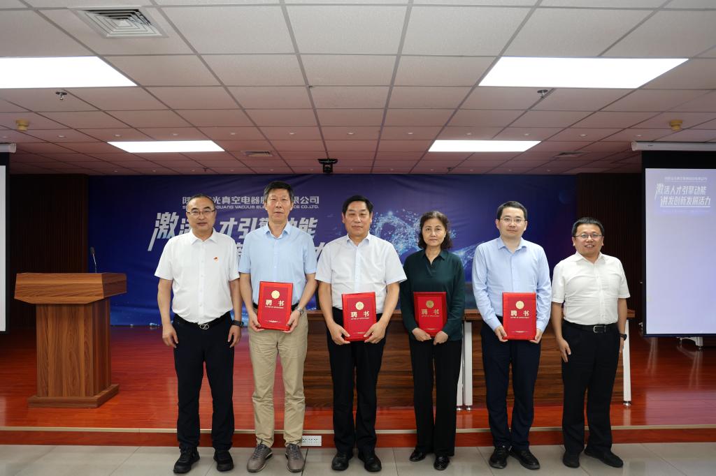 寶光股份黨委副書記、紀委書記姚書勤,副總經理袁軍為分別宣讀了高層次科技創新人才和重大創新團隊名單。謝洪濤為元復興、劉志遠、顏莉萍、馬慧4名外部專家頒發了聘書,組織簽訂了內外部師帶徒協議。向高層次科技創新人才頒發了聘書,并與重大創新團隊負責人簽訂了定向支持承諾書,首批選取了變壓器有載分接開關真空滅弧室研發、252kV單斷口真空滅弧室研發、高電壓真空滅弧室研發、高可靠彈性元件研究四個項目做為重大創新項目進行專項激勵,與項目帶頭人簽訂了激勵任務書。外部專家的加入不僅為企業提供了強有力的智力支持,更能通過指導和交流激發企業內在技術研發創新動力,這為高層次科技創新人才培養和重大創新團隊后期工作開展提供了方向引領和堅實技術支持保障。