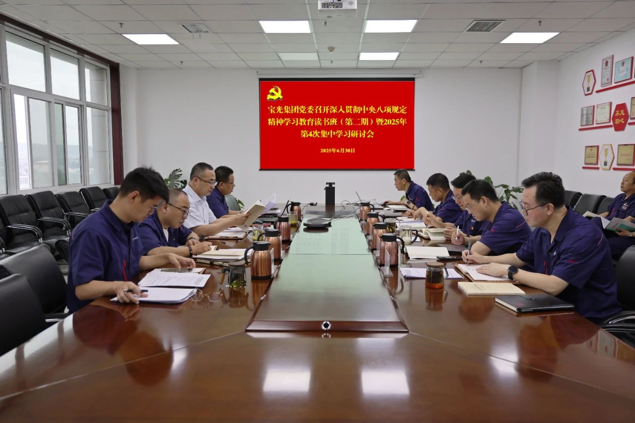 6月30日,寶光集團黨委召開深入貫徹中央八項規定精神學習教育讀書班(第二期)暨2025年第4次集中學習研討會。寶光集團黨委書記、董事長謝洪濤主持會議并講話。本次深入貫徹中央八項規定精神學習教育讀書班(第二期)暨2025年第4次集中學習研討會,采取中心組集中學習、班子成員領學、觀看視頻、交流研討相結合的形式開展。