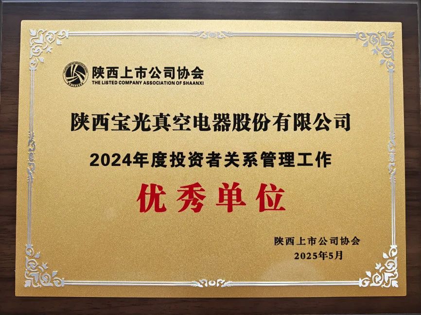 近日,陜西上市公司協會與陜西證券期貨業協會聯合公布2024年度評優結果,寶光股份憑借在投資者關系管理領域的創新實踐與卓越成效,斬獲"2024年度投資者關系管理工作優秀單位"殊榮,這是對企業長期深耕投資者關系管理、推動資本市場良性互動的高度肯定。