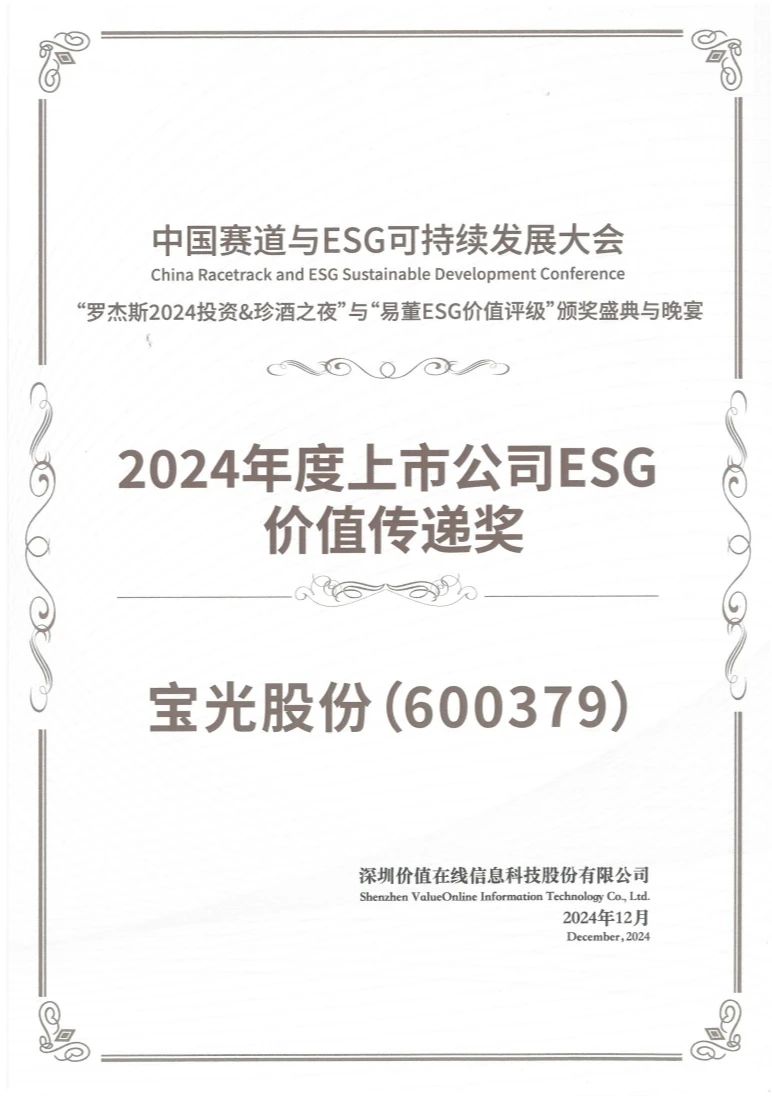 12月8日,易董價(jià)值在線(xiàn)ESG價(jià)值評(píng)級(jí)頒獎(jiǎng)盛典在深圳舉行,寶光股份憑借在ESG方面的突出表現(xiàn),堅(jiān)持透明、負(fù)責(zé)任的ESG實(shí)踐及有效的價(jià)值傳遞,榮獲“2024年度上市公司ESG價(jià)值傳遞獎(jiǎng)”。該獎(jiǎng)項(xiàng)的獲得是對(duì)寶光股份在ESG信息披露、投資者關(guān)系管理和市場(chǎng)溝通等方面的認(rèn)可。