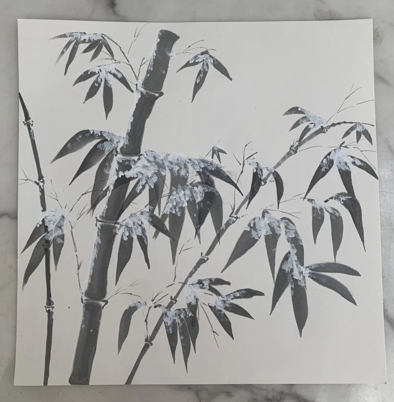 高蕾的書畫作品《素雪映竹枝》以簡潔的筆觸勾勒出素雪覆蓋下竹枝的堅韌與清雅,盡顯傳統書畫的韻味與魅力。