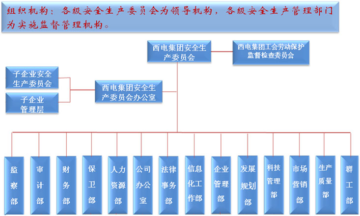 按照《中華人民共和國安全生產(chǎn)法》和《中央企業(yè)安全生產(chǎn)監(jiān)督管理暫行辦法》(國務(wù)院國資委令第21號(hào))的有關(guān)規(guī)定,通過不斷完善,西電集團(tuán)已形成了以各級(jí)安全生產(chǎn)委員會(huì)為領(lǐng)導(dǎo)機(jī)構(gòu),各級(jí)安全生產(chǎn)監(jiān)督管理部門實(shí)施監(jiān)督管理的 “分級(jí)管理、分線負(fù)責(zé)、全面覆蓋”的安全生產(chǎn)管理網(wǎng)絡(luò)。